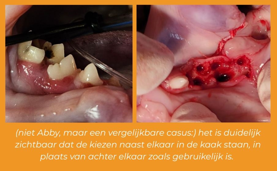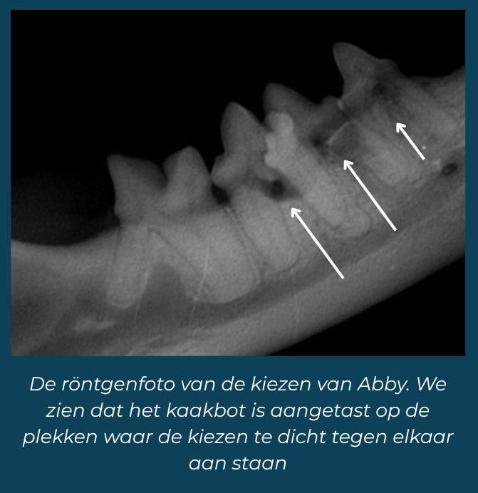 Haar baasje was zich hier goed van bewust: zij poetste het gebit van Abby bijna dagelijks met een tandenborstel. Hierdoor was zij er ook snel bij toen zich een probleem begon voor te doen. Er was van buiten niets te merken aan Abby, en haar eetlust bleef gewoon goed, maar met het tandenpoetsen viel het op dat haar tandvlees wat gevoelig was en af en toe zelfs bloedde. Reden genoeg om een gebitsbehandeling in te plannen.