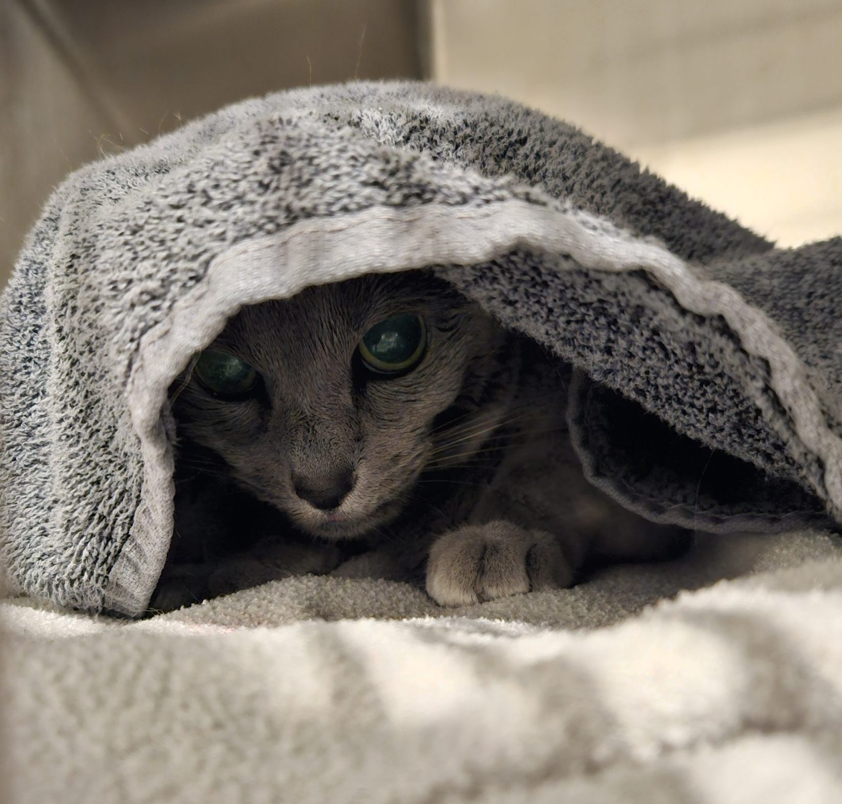 Abby mocht na de behandeling lekker warm bijkomen in onze opname, waar ze goed gebruik maakte van alle kleedjes om zich onder te verschuilen.